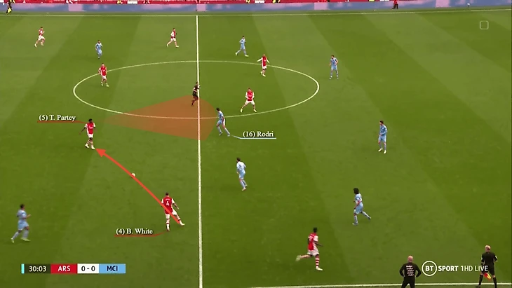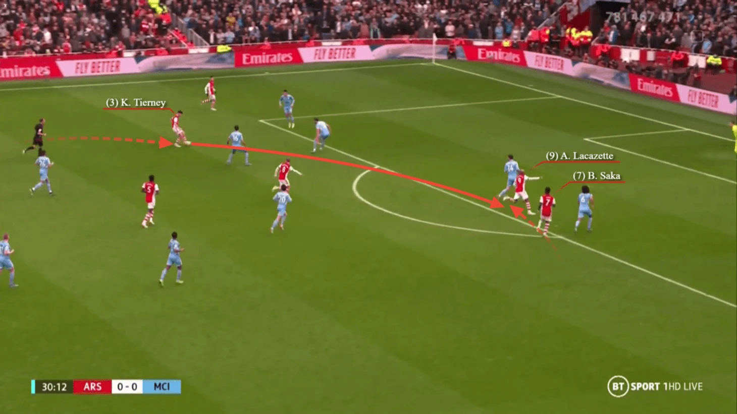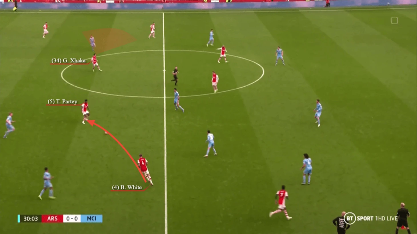 Первый тайм против Манчестер Сити стал большим испытанием для остроты передач для остроты и целеустремленности передач Арсенала. Канонирам удалось нанести всего 7 ударов при 29% владения мячом, но команда представляла угрозу, делая как можно больше передач с ограниченным числом касаний. В первом тайме было несколько таких случаев, но самым ярким примером стал гол Сака. Партей просканировал ситуацию на поле, прежде чем получить мяч в центре поля и уже имеет четкое представление о том что окружает его, как и Гранит Джака слева от него