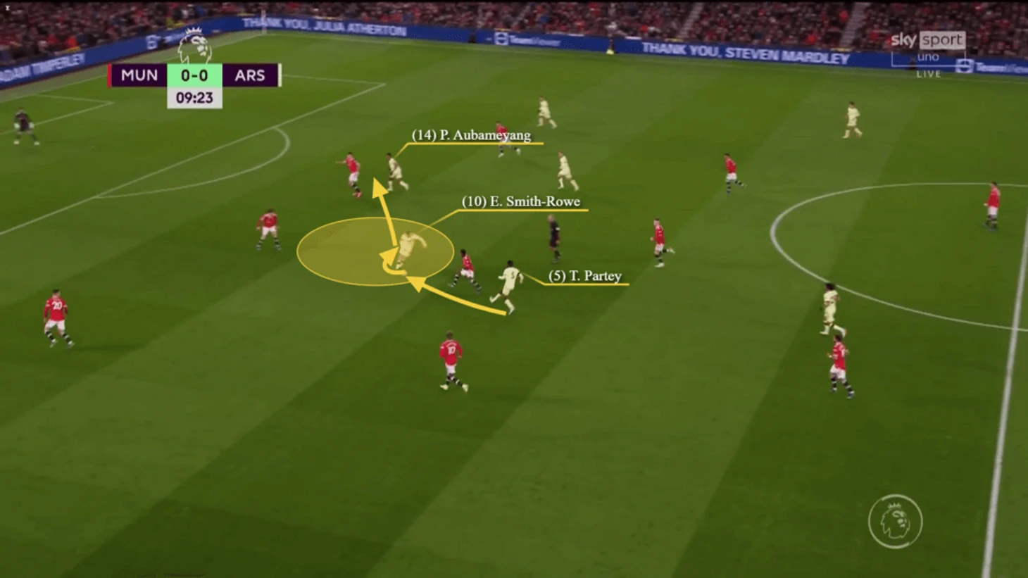 Затем Партей прорывается вперед, когда Эмиль Смит Роу смещается между линиями. Следует еще один простой пас в свободную зону, Смит Роу получает мяч и на развороте вторым касанием передает мяч Обамеянгу.
