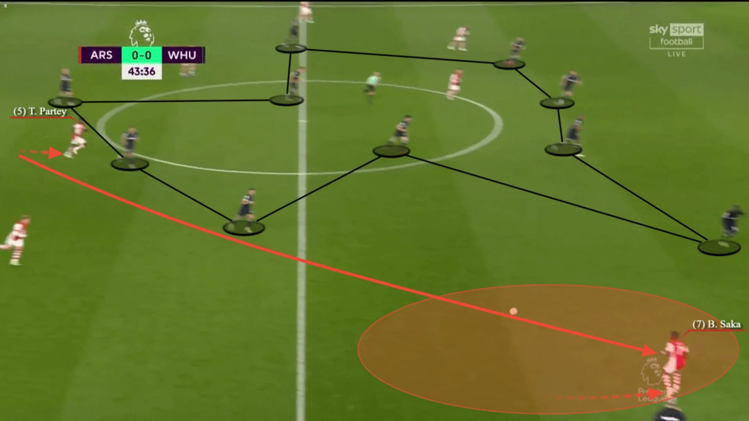 Быстрое перемещение мяча также помогло создавать моменты для удара в матче против Вест Хэма. Здесь Партей находит свободную зону, использует ее по любой возможности и отдает размашистую передачу на Сака.