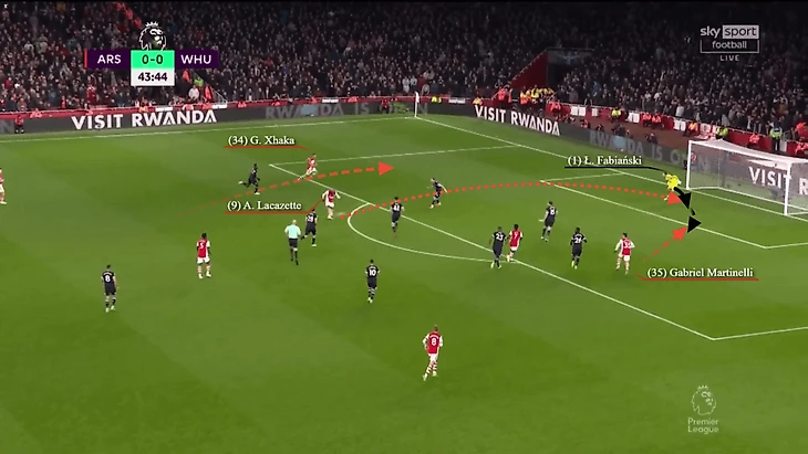 Сака выдвигается вперед, находит в свободной зоне Ляказетта, тем временем Мартинелли забегает в штрафную и имеет возможность продолжить атаку.