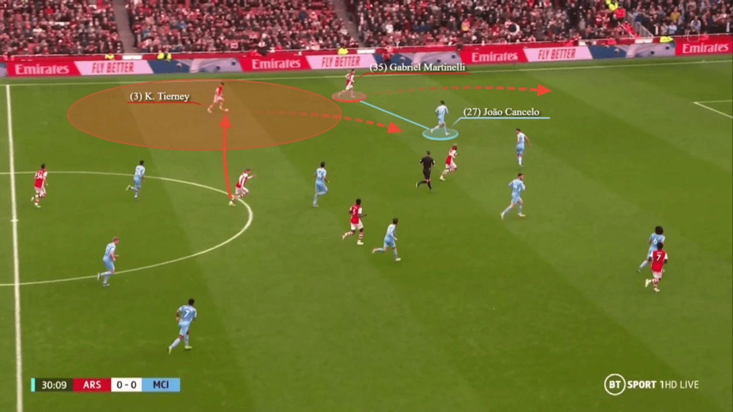 Эдегор также пасует в два касания на Тирни. Кроме того что шотландец получает мяч в свободной зоне, Мартинелли продолжает движение вперед и занимает зону Жоао Канселу.