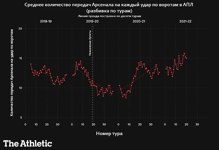 По ходу игры может все измениться, но средний показатель в 14,5 действий на один удар в матче является наивысшим показателем Арсенала, после ухода Арсена Венгера.