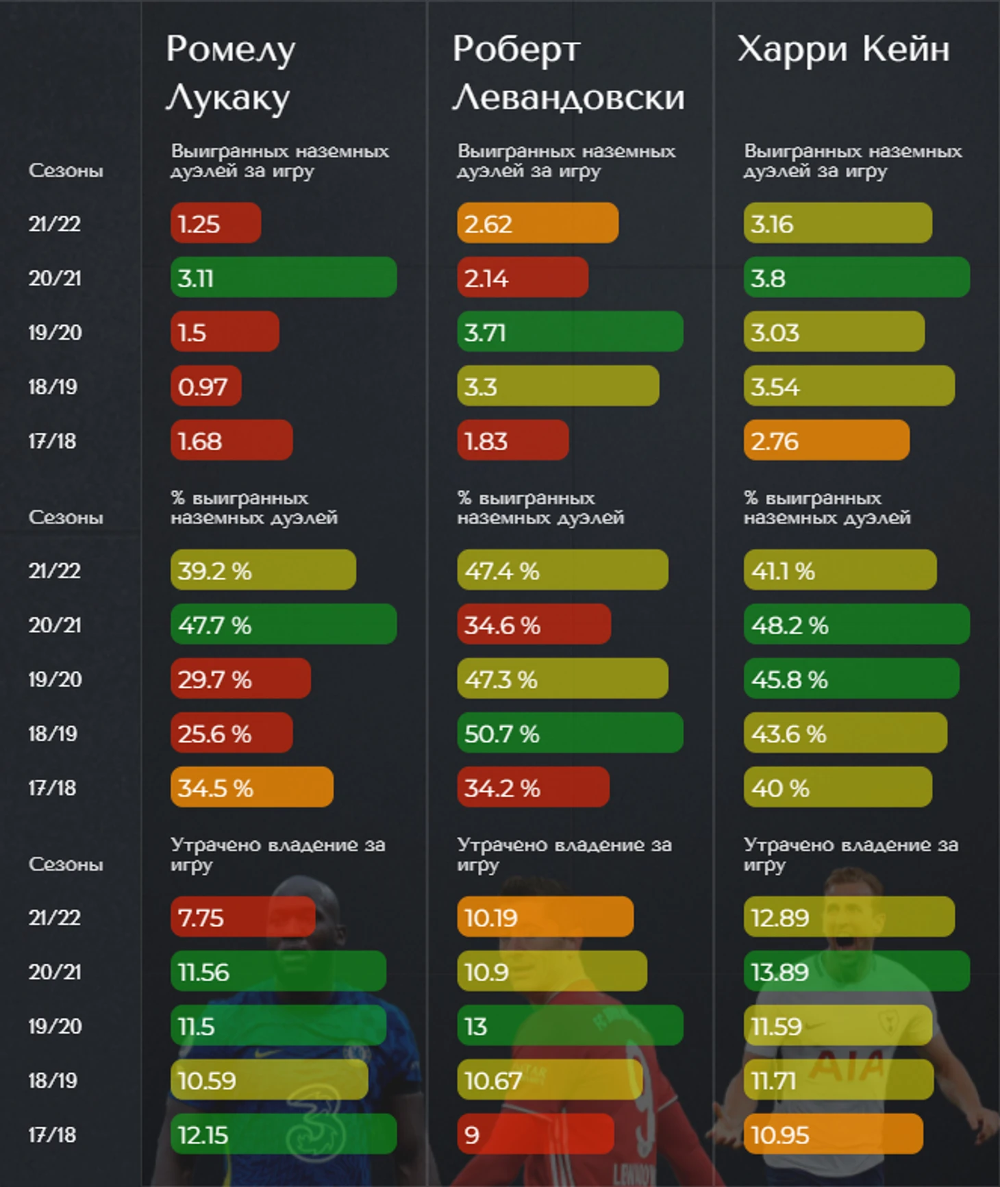 Ну и звание "Пешкоку" вполне оправдывают цифры возврата владения в финальной трети - тут Лукаку даже в лучшие итальянские сезоны выдавал цифры, которые являются средними для Кейна и ужасными для Левандовского. В общем, в плане прессинга и контрпрессинга у форварда всё плохо.