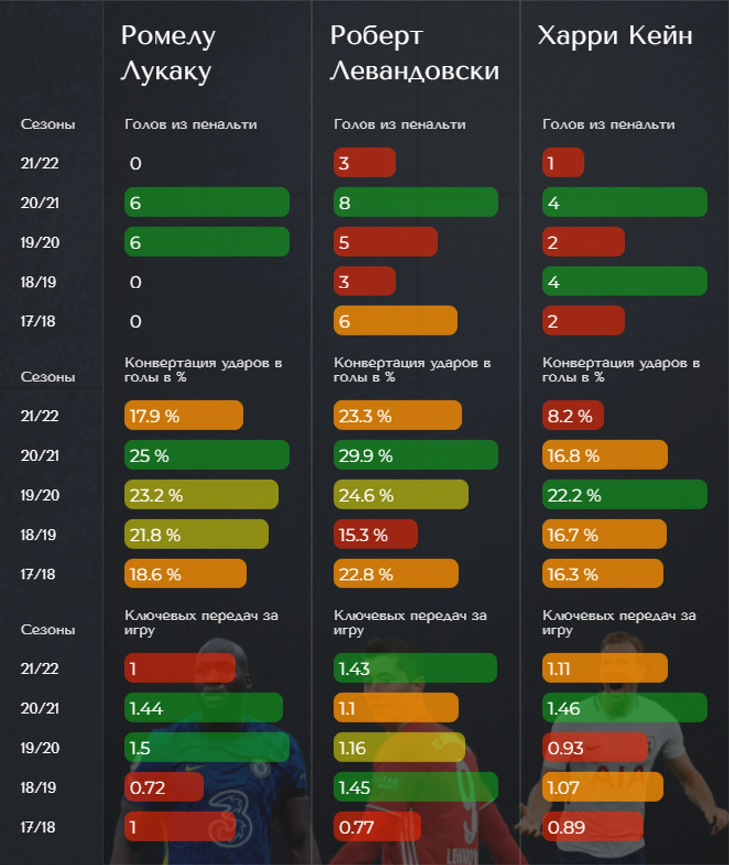 У того же Левандовского был сезон 18/19, когда он порол очень много моментов и не забивал другие: отсюда "всего" 22 гола, 32 упущенного явного момента и конвертация ударов в голы на уровне 15%.