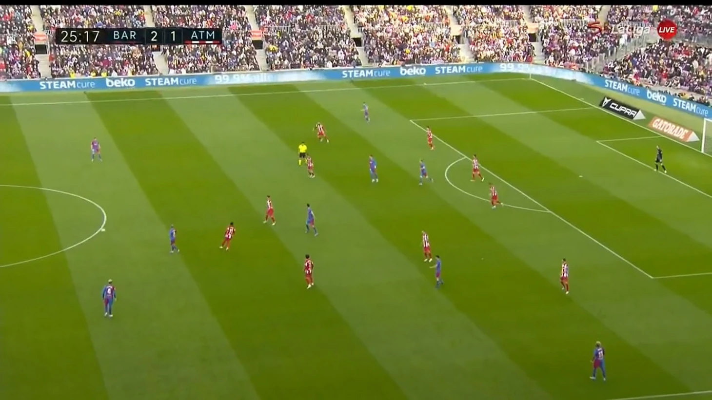 Барса шикарно контрпрессинговала, не давая Атлетико выбежать в контратаки. Парадоксально, что по итогу матча у команды Симеоне больше ударов, но Барселона просто играла по счету. Каталонцы контролировали матч через владение, не давая Атлетико перехватить инициативу - забавно, что у "матрасников" не получилось этого даже после удаления Дани Алвеса.