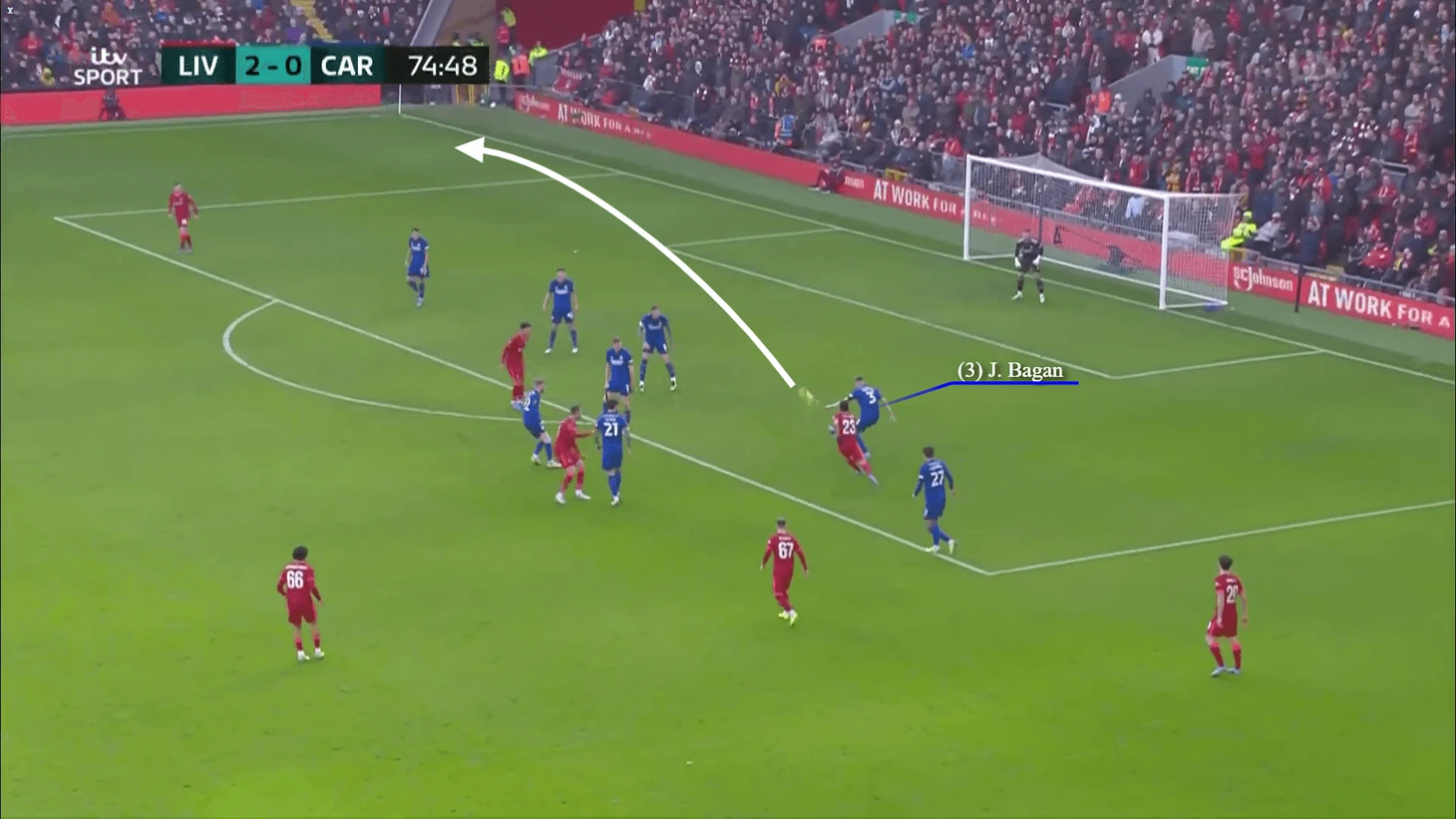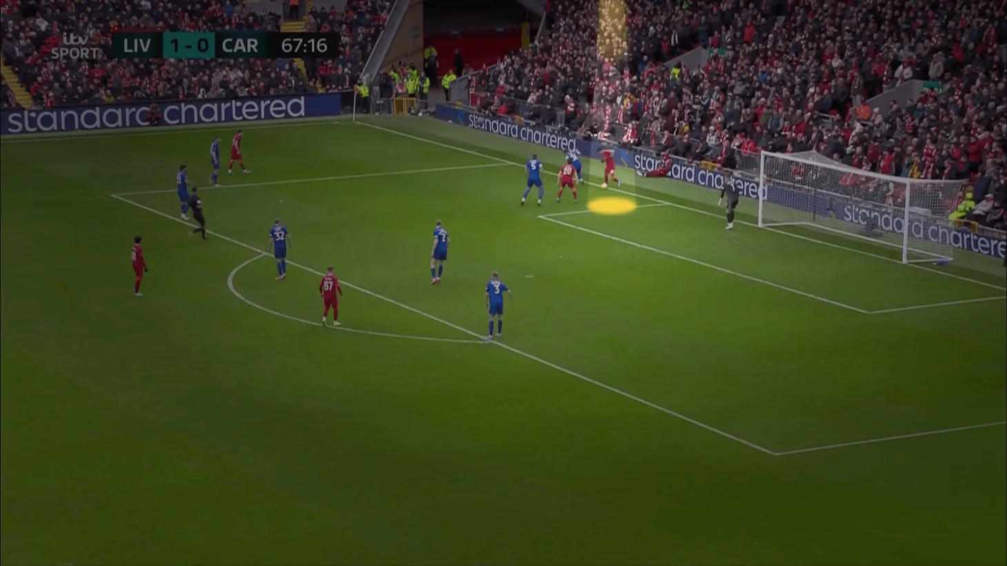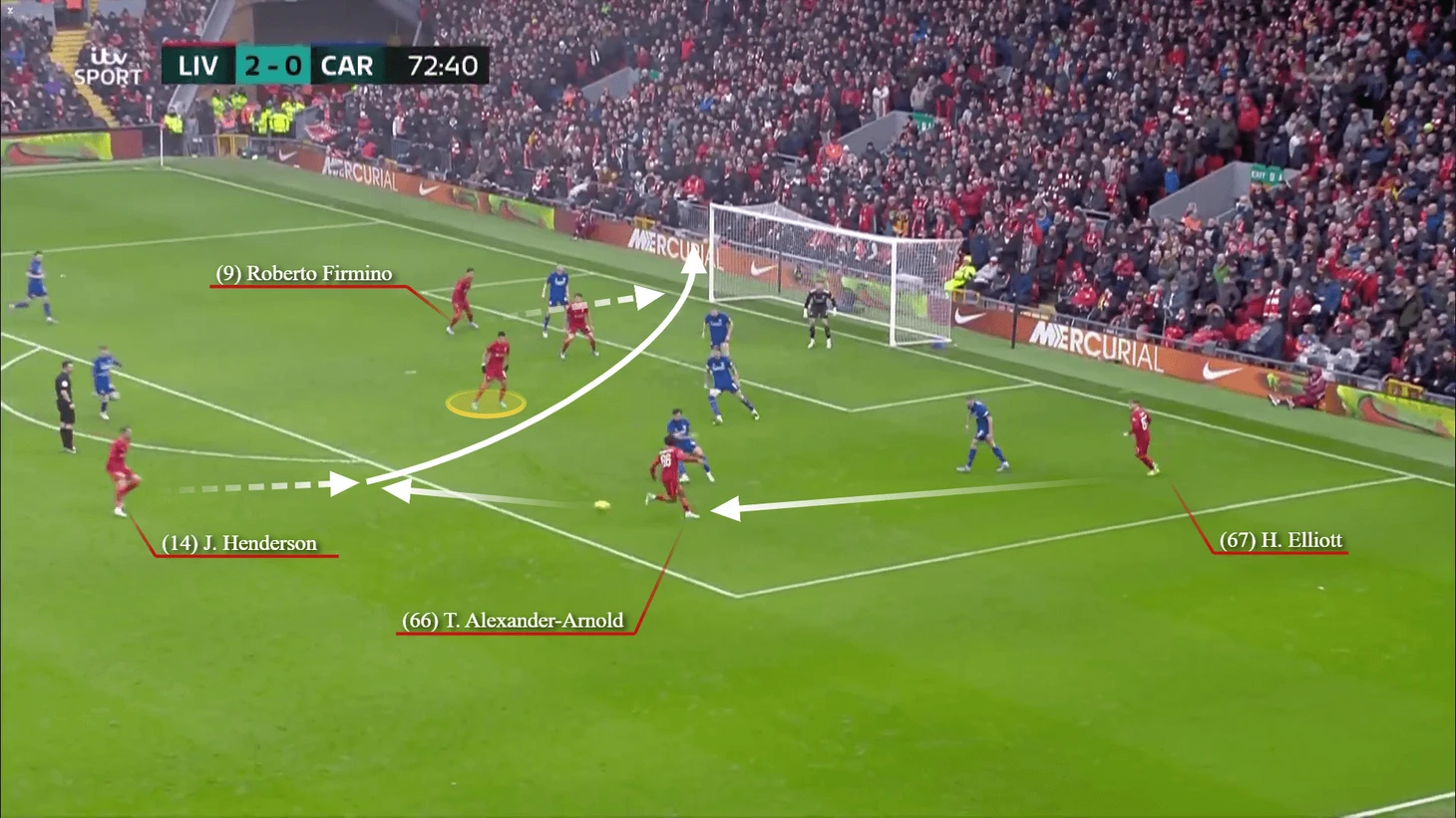 Мяч послан с немного слишком большой скоростью, и Эллиотт подбирает его на углу штрафной, после чего пасует на Трента Александер-Арнолда.