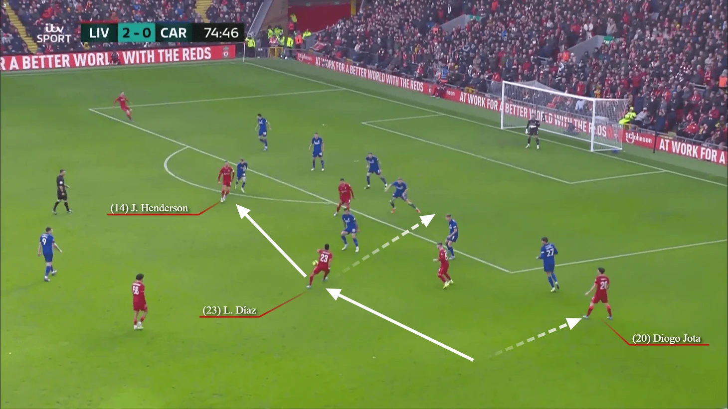 Несколько минут спустя Диас был очень вовлечен в комбинацию, когда «Ливерпуль» почти забил прекрасный командный гол.