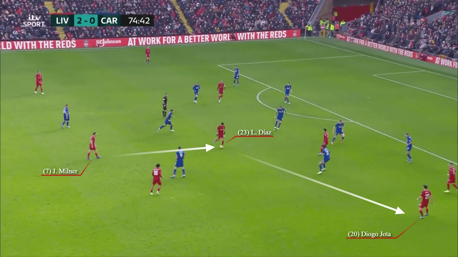 После еще нескольких обменов пасами между троицей, включая пас пяткой от Милнера, Хендерсон отправил Диаса в забег на территорию «Кардиффа».