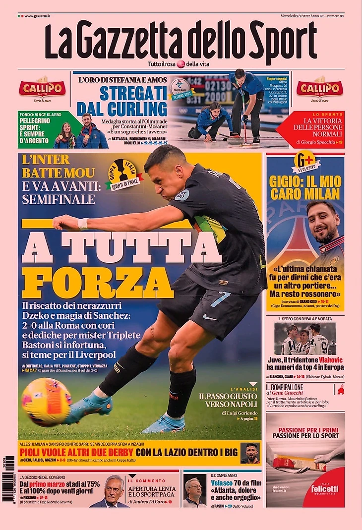 «Реакция, достойная «Интера» – написала Corriere о победе Нерадзурри в матче Кубка после поражения в Дерби: «Кубок Италии, «Рома» побеждена на «Сан Сиро» (2:0). Песни и аплодисменты для Моуриньо. Искупление после Дерби: Индзаги в полуфинале благодаря паре Джеко-Санчес. Счёт в матче открыл босниец, который не стал праздновать. После перерыва гол-шедевр от чилийца. Джаллоросси опасны благодаря Дзаньоло. Симоне: «Матч личностей». Жозе раскритиковал арбитра Ди Белло».
