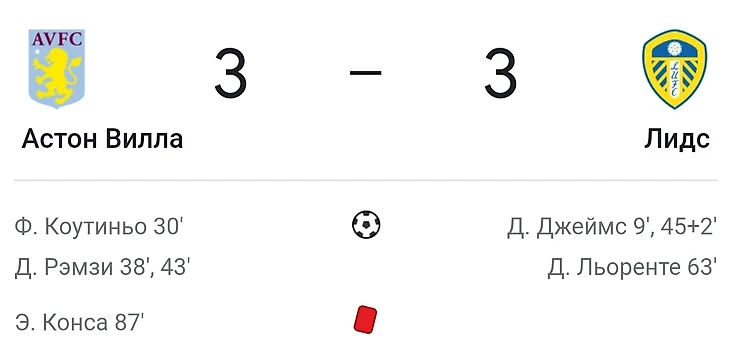 Боевая ничья 3-3. Астон Вилла собрала вполне себе боевой состав, а ещё и под руководством Джеррарда я думаю всё у них получится, остаётся немного подождать.