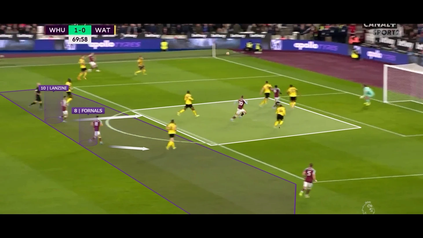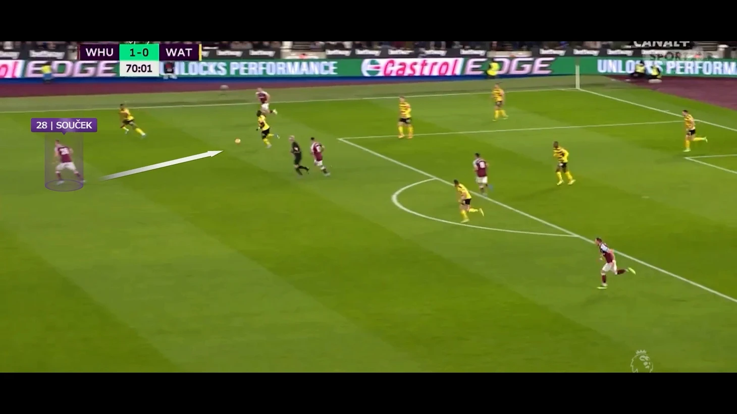 Команда Дэвида Мойеса претендует на место в четверке лучших, но часто проваливается. Например, в матче с «Уотфордом» «молотобойцы» не успевали на подбор, а в эпизоде ниже заняли неправильные позиции. Лансини мог бы идти в зону завершения, чтобы быть первым на подборе, а Соучек должен был играть с футболистом на подборе.