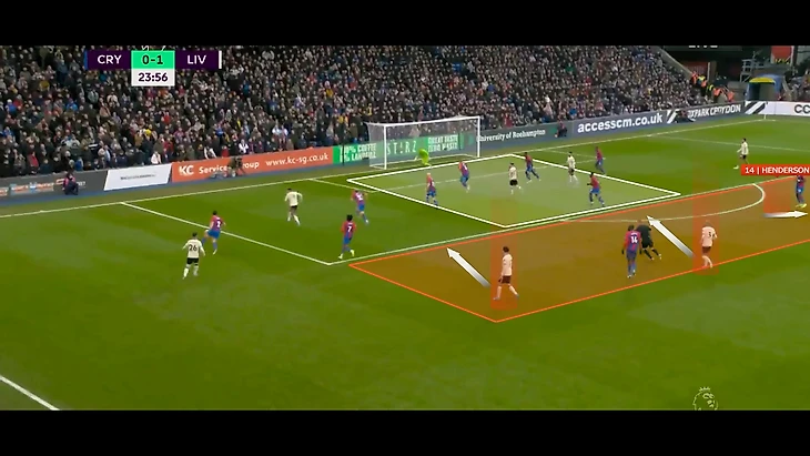 В зоне завершения у «Ливерпуля» минимум 3 игрока, в зоне подбора (выделена красным) важно играть как можно ближе с игроками, чтобы опередить соперника и вступить в отбор. Сбалансированное расположение позволяет быть первыми на подборе, вступать в отбор или фолить в крайнем случае. Такие действия также позволяют игрокам создавать постоянное давление у ворот соперника.