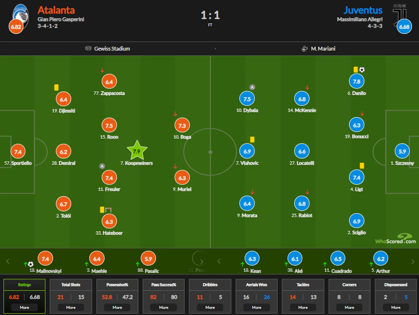 Малиновский весьма тянет на лучшего игрока матча, если судить по критерию время/кпд, хотя Демирал самостоятельно уничтожил всю звёздную (пускай Мората тоже хоть когда-то побудет звездой) тройку нападения Ювентуса. Щенсный и Де Лигт, конечно, тоже накуролесили, но косвенно: поляку повезло, что никто его не наказал за безобразные выходы, а Де Лигт вроде и ошибался, да и после его нарушения на Малиновском команда пропустила, но результативных ошибок на него не записали. Везунчики, однако.