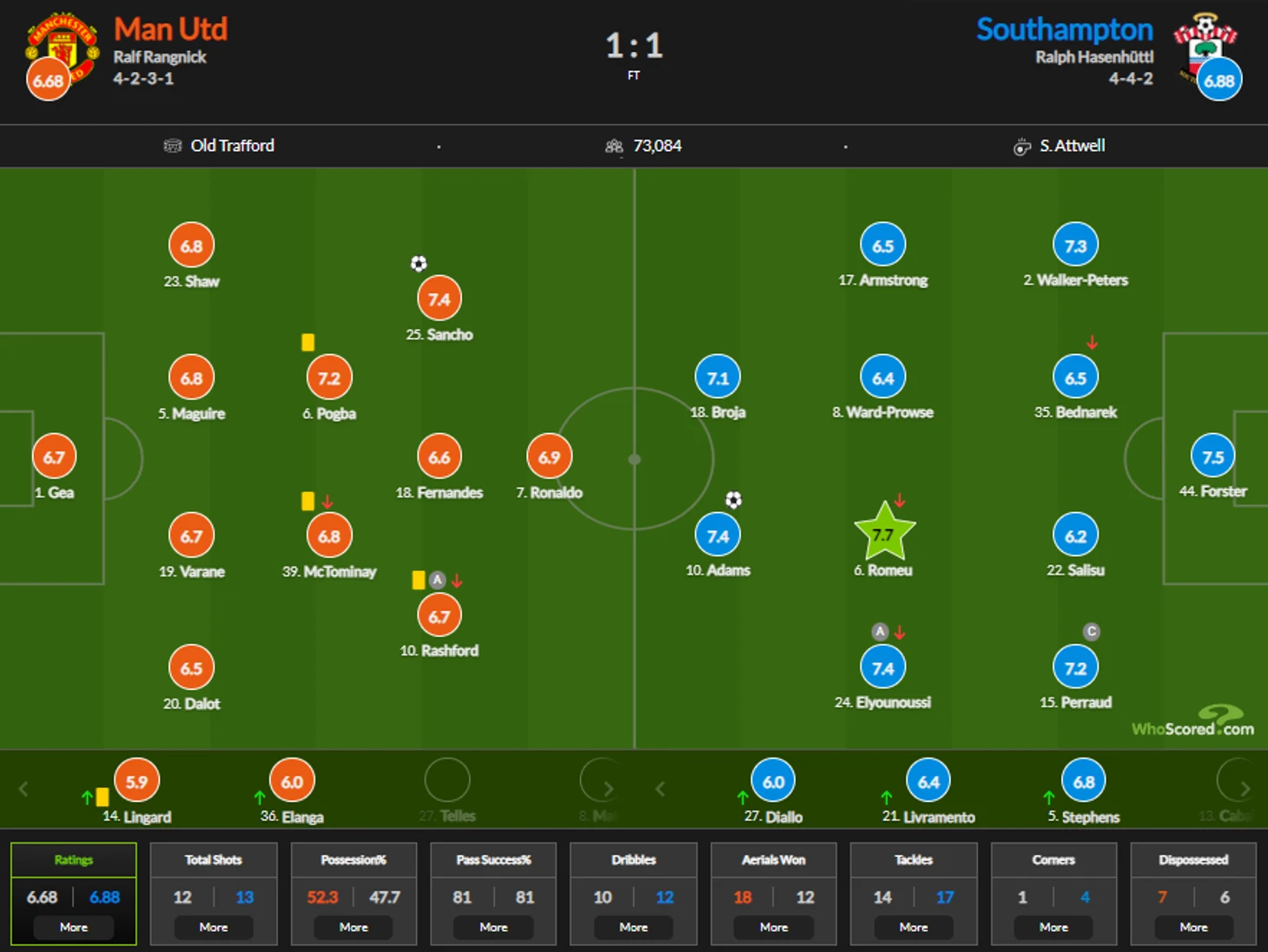 МЮ здорово выключил из игры Брою, которому удалось всего 1 раз пробить по воротам. Албанец проигрывал борьбу Магуайру и Шоу, поэтому Саутгемптон предпочитал задействовать Армстронга, Перро и Питерса, сделав акцент на многочисленных кроссах.