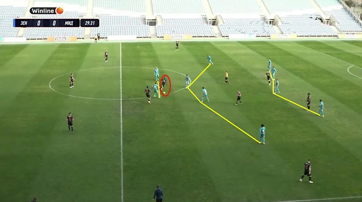 На рисунке ниже представлен эпизод из матча с Митьюлланд, где полузащитник соперника, пытаясь сыграть между линиями, был «схлопнут» игроками Зенита. В итоге владение легко вернулось СБГ.