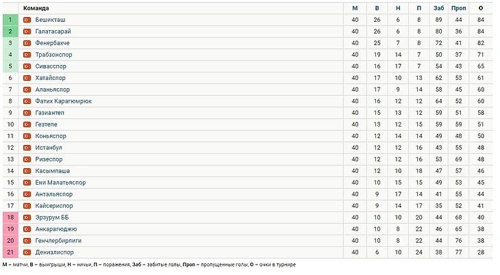 Для сравнения: вот так выглядела таблица по итогам прошлого сезона. Да, нынешний лидер «Трабзонспор» прилично отстал от тройки, закрывшей все медальные позиции.
