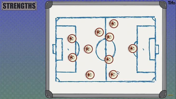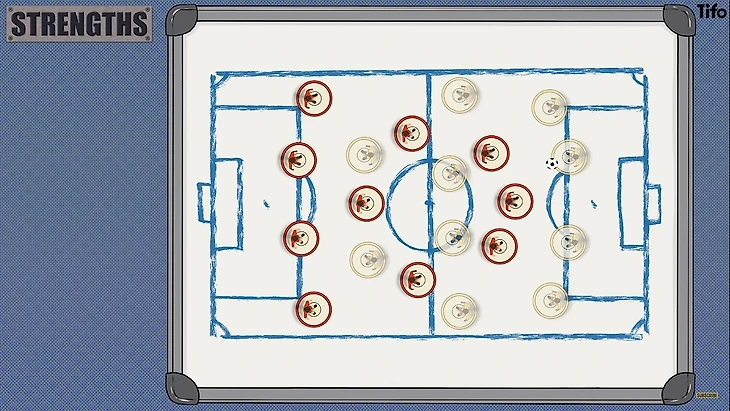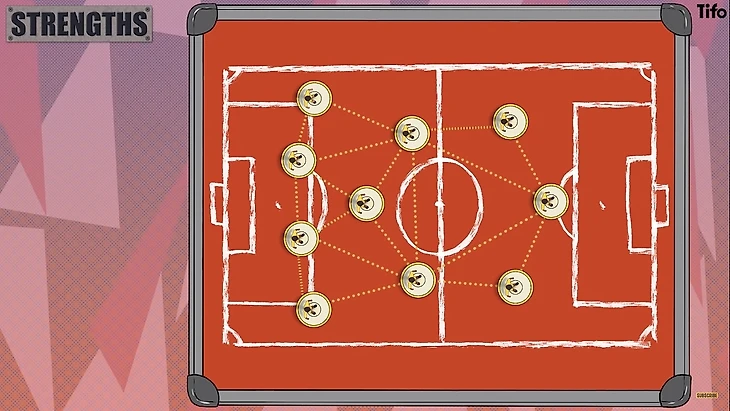 Эта структура помогает естественным образом создавать треугольники по всему полю. У игрока с мячом всегда есть варианты для простых и надежных передач - он имеет как минимум два варианта для коротких передач, что в свою очередь упрощает сохранение владения мячом.