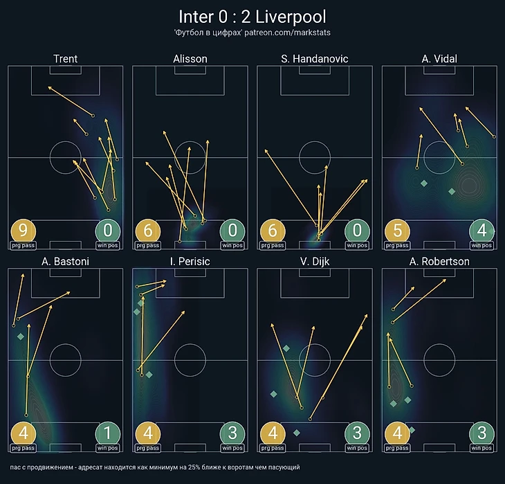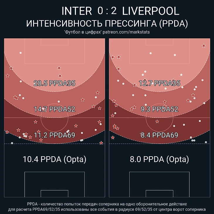 Ну а теперь стоит подвести итоги матча, а также более общие причины того, что мы увидели на поле. "Ливерпуль" все-таки создал больше: 9-13 по ударам, 0,5-1,46 по xG и 0-2 по явным голевым моментам. Ну и стандарты выручают Клоппа уже не в первый раз, однако настолько выдающаяся игра на угловых и штрафных не может продолжаться вечно. "Ливерпулю" необходимо приходить в оптимальную форму, чтобы стабильно забивать с игры. А "Интер" показал очень приятную игру при необычном плане с персональным прессингом. Но очевидной проблемой такого плана является необходимость очень много бегать, а сейчас физическая форма миланцев явно проседает.