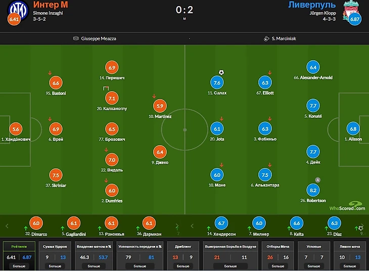 Ван Дейк признан лучшим игроком матча, что выглядит справедливо, учитывая давление "Интера", которое не привело к голу только благодаря отличной игре обороны. Сегодня отлично сыграл в высокой линии обороны, просто обгоняя и Думфриса, и Джеко, что, конечно, не так и трудно сделать. На его счету 7/8 точных длинных передач, 5/7 выигранных верховых единоборств, 7 выносов и 3 перехвата.