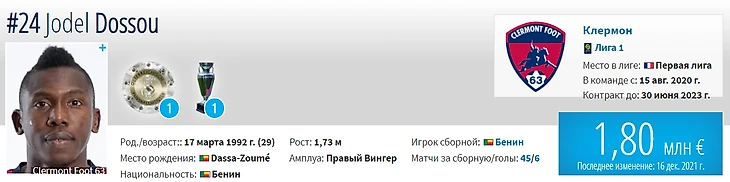 Жодель Доссу - ещё одна ключевая личность для атаки "Клермона", очень резкий и техничный, атлетичный и хорошо видящий поле игрок с богатой клубной и трофейной биографией, по происхождению - бенинец.