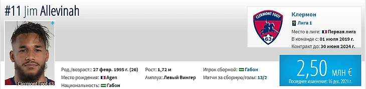 Джим Аллевина - один из ключевых игроков атаки клуба "Клермон", несколько сезонов выступающий за клуб, очень техничный и быстрый, способен разогнать атаку или самостоятельно создать остроту у ворот противника, по национальности - габонец.
