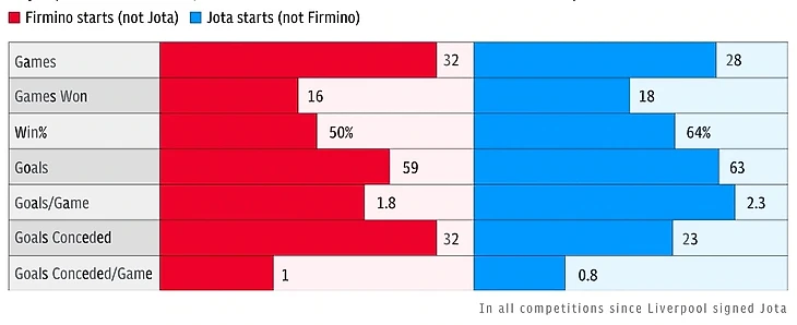 Тelegraph приводит графику, которой доказывает, что Диогу Жота в качестве центрфорварда действует полезнее Роберто Фирмино. С португальцем "Ливерпуль" больше забивает и меньше пропускает.