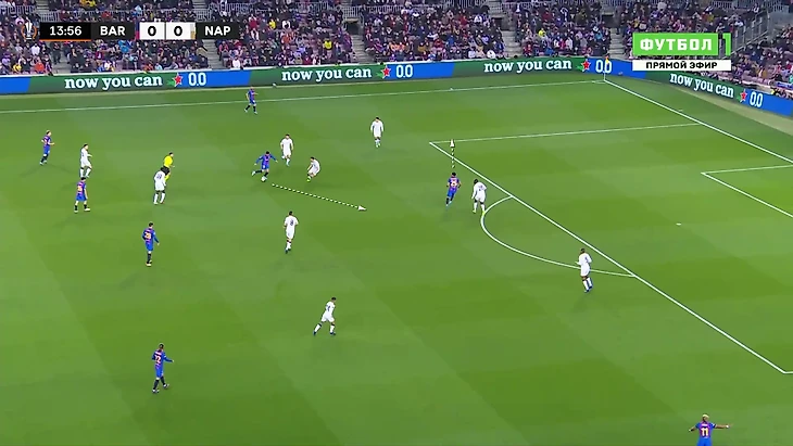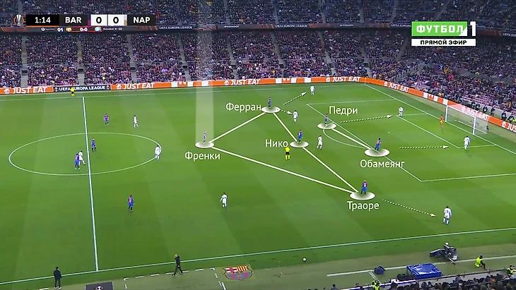 Когда гости разыгрывали от ворот, «Барса» располагалась в схеме 4-4-2 ромб. В этой стадии на одну линию к Обамеянгу поднимался Педри, Нико контролировал техничного Руиса, а Френки страховал сзади. Отличались и роли Феррана и Траоре: первый контролировал возможный пас на Замбо-Ангисса и Ди Лоренцо, а второй присматривал за Жезусом. Дальше начиналось давление – обычно с Педри:
