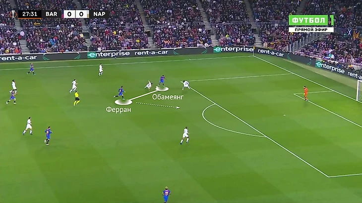 Важно, что из-за смены позиций не страдал контрпрессинг «Барсы». После потери оба здорово вступали в отбор – просто теперь Ферран выступал как ситуативный центральный нападающий, а Обамеянг как временный вингер: