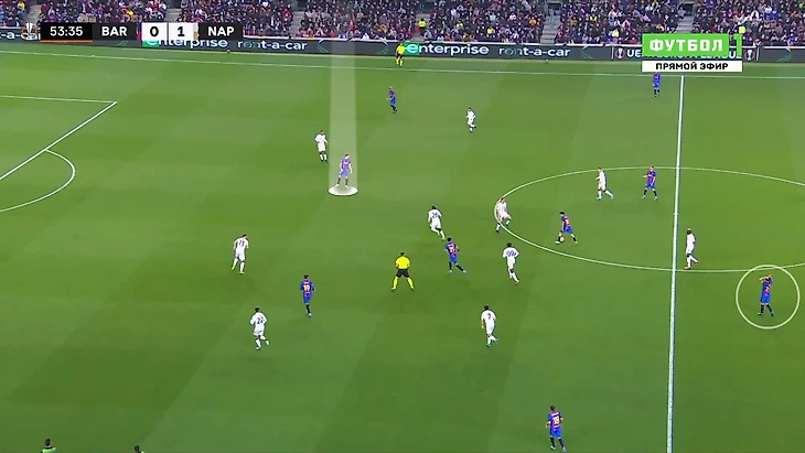 Из-за того, что «Наполи» почти не прибегал к забросам на Осимхена и фанатично разыгрывал через короткий пас, «Барселона» могла прессинговать относительно смело. Уровень смелости менялся в зависимости от стадии, на которой «Наполи» пытался владеть мячом.
