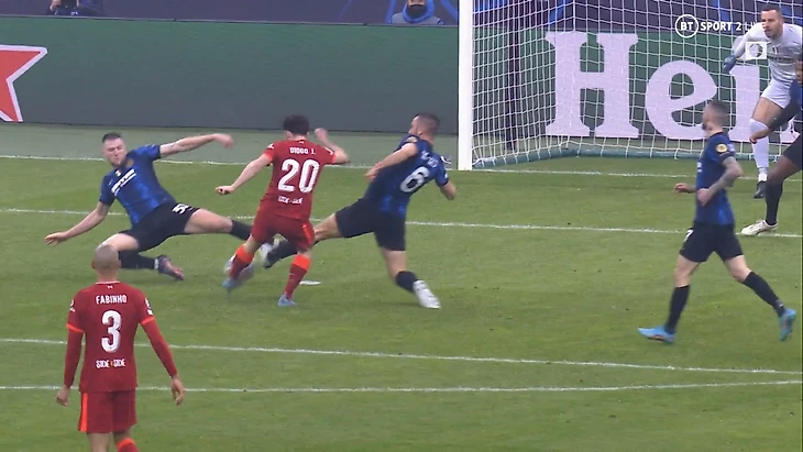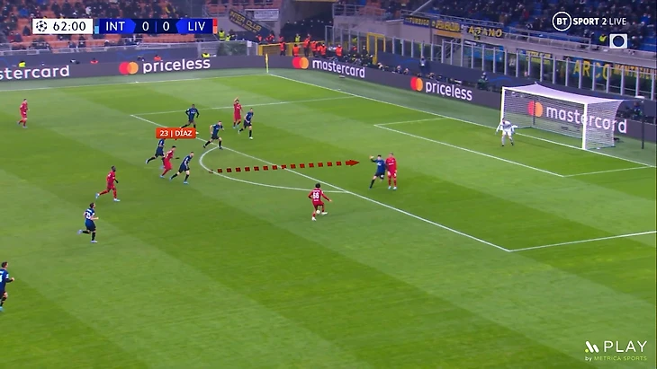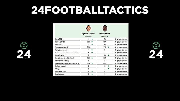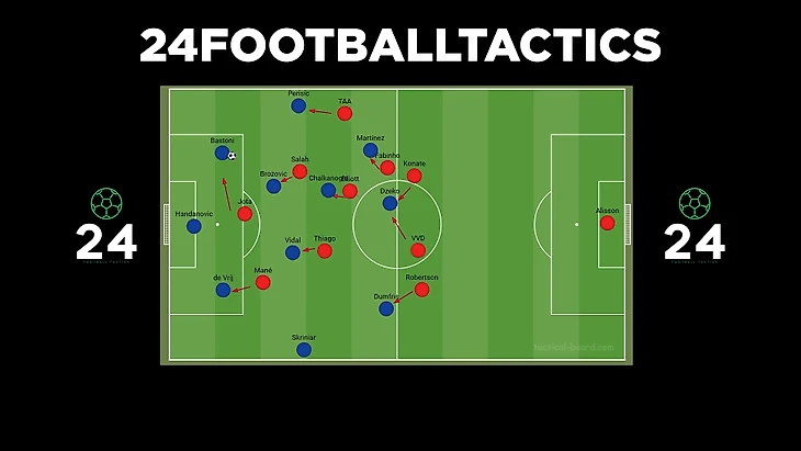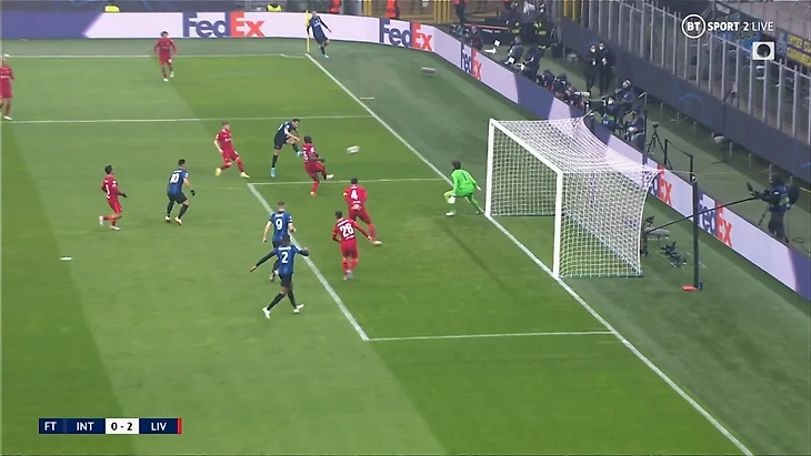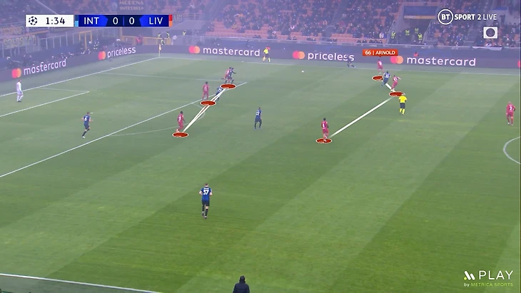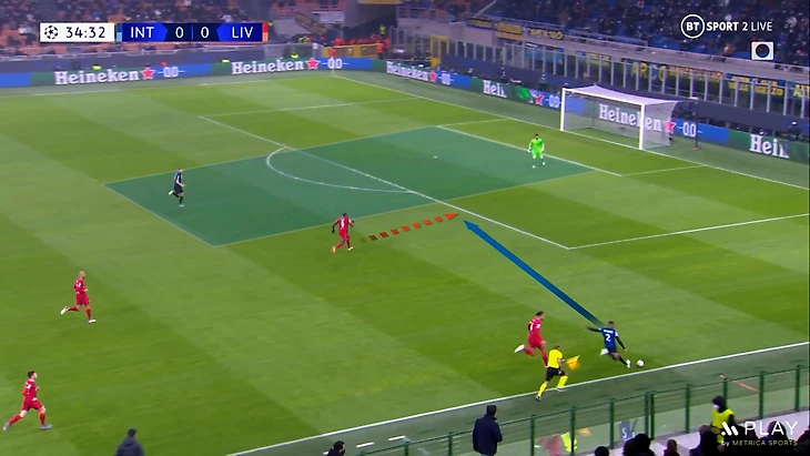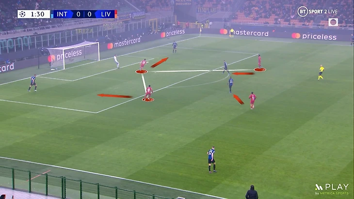 При такой игре защитникам очень важно держать высокую линию, но это может привести к передачам за спину. Но у Конате и ван Дейка отличная скорость, что помогло нейтрализовать такие попытки «Интера». Также они выиграли почти всю верховую борьбу и перехватывали много передач в штрафную площадь.