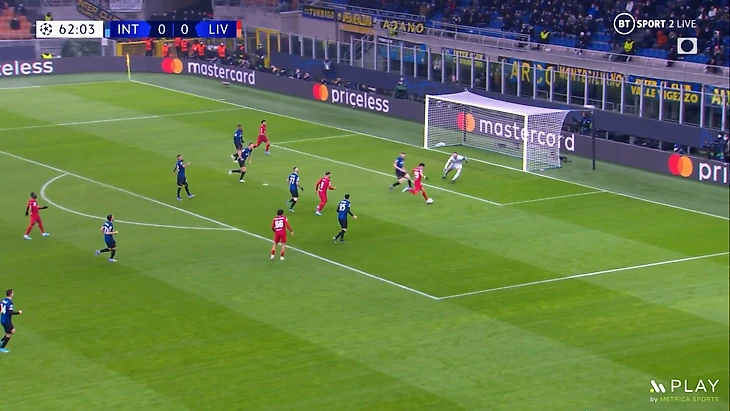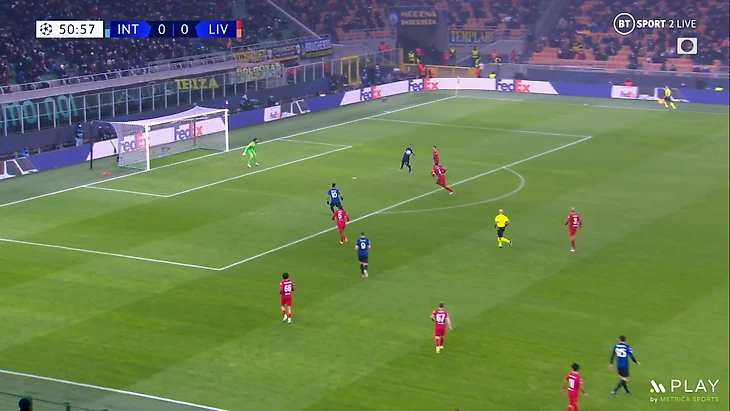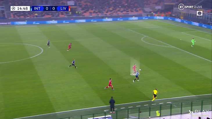 Из-за этого часто за спинами у крайних защитников «Ливерпуля» было пространство которое Интер часто пытался использовать через длинный пас, но восхитительная игра ван Дейка и Конате в этом матче, о которой мы поговорим еще в конце видео — не позволяла ничего сделать.