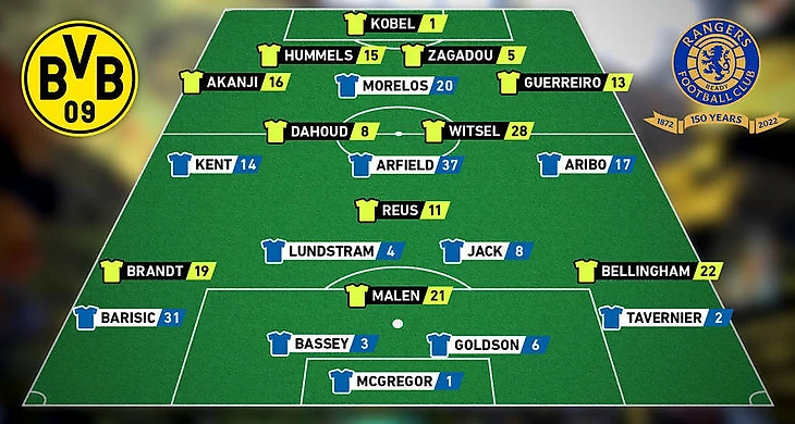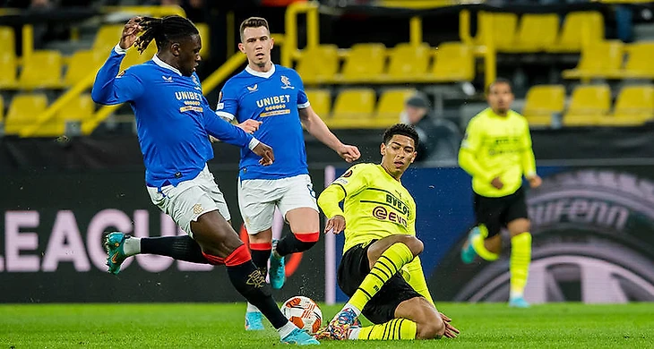 На этой неделе в еврокубках, включая Лигу Европы, где играет дортмундская «Боруссия», начались игры на вылет. В четверг 17 февраля черно-желтые на своем стадионе «Сигнал Идуна Парк» принимали шотландский клуб «Рейнджерс». Это был юбилейный 1000-й матч черно-желтых на родном стадионе, который ранее назывался «Вестфаленштадион». Марко Розе выбрал ту же тактическую расстановку, что и в Берлине: с Кобелем в воротах, с четырьмя защитниками (Матсом Хуммельсом и Дан-Акселем Загаду в центре) перед двумя «шестерками» (Махмуд Дауд и Аксель Витсель). При этом левый защитник Рафаэль Геррейро играл гораздо ближе к чужим воротам, чем его партнер по команде Мануэль Аканджи на правом фланге. Меняясь местами с Джудом Беллингемом, португалец неоднократно смещался на левый полуфланг полузащиты, а иногда и в центр. Впереди у дортмундцев было три атакующих игрока: Марко Ройс в центре с широким радиусом действия, Юлиан Брандт – справа, и Дониэлл Мален – на острие атаки.