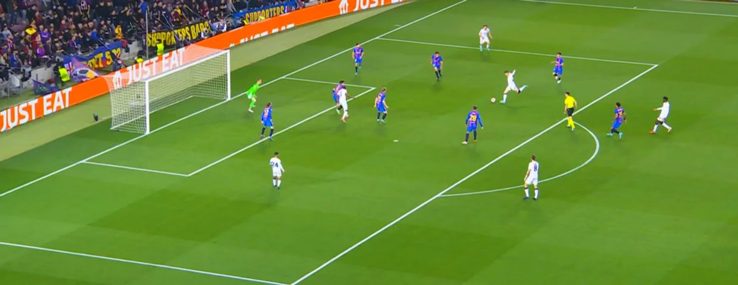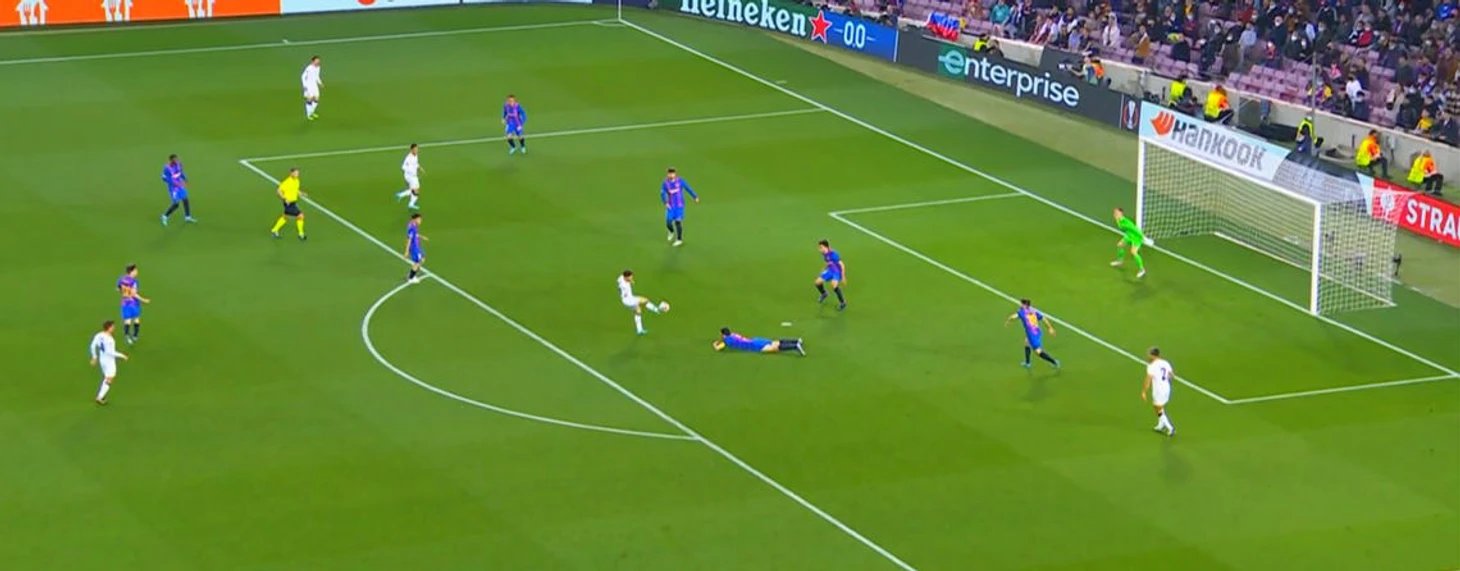 К сожалению, проблемы в обороне бывают у нас не только, когда соперник на всех парах мчит к владениям тер Штегена. В эпизоде с пропущенным голом Эльмас сначала обыгравшись с Зелински в одно касание, разом ушёл от Альбы, Гарсии и Педри, а потом уже самолично финтом эффектно обыграл вновь настигшего его Альбу. Эльмас снова отпасовал на Зелински и тот со второй попытки пробил тер Штегена из пределов штрафной. Вроде бы и полкоманды каталонцев у своих ворот, но в защите всё равно образуется целая просека для удара, чем и пользуется Пётр. Отдельно вопрос к Френки, который просто несколько секунд стоял и ничего не делал, хотя, у него была неплохая позиция, чтобы закрыть поляка и не дать ему ударить. Пике тоже будто на долю секунды застыл, когда Зелински добивал мяч в ворота.