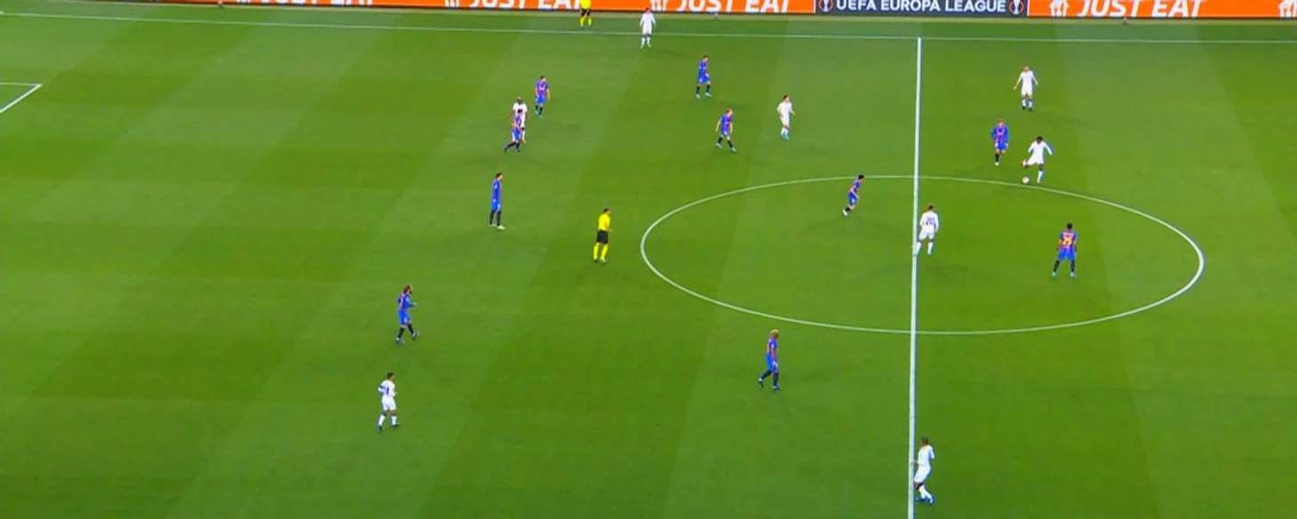 При билдапе «Барса» часто играла в три защитника (а то и в два ярко выраженных центральных), а четвёртый – выдвигался вперёд. Какого-то жёсткого распределения ролей не было, поэтому продвигать мяч мог не только, Альба и Гарсия, но и Пике с Мингесой, последние даже больше. В роли третьего иногда выступал и Френки де Йонг. Всё ситуативно. Однако, в целом каталонцы держали достаточно высокую защитную линию, поэтому при контратаках (или таковых попытках) «Наполи», какую-то красивую стройность оборонительных порядков держать не всегда удавалось. На скриншоте ниже показано, что как только «Барса» потеряла мяч и «неаполитанцы» пошли в атаку (пускай и неопасную из-за неточного паса), ситуация сразу не выглядит приятной – три игрока защиты против трёх игроков нападения. При том, имеющаяся тройка оборонцев асимметрично распределена по полю, ещё и лицом к своим воротам.