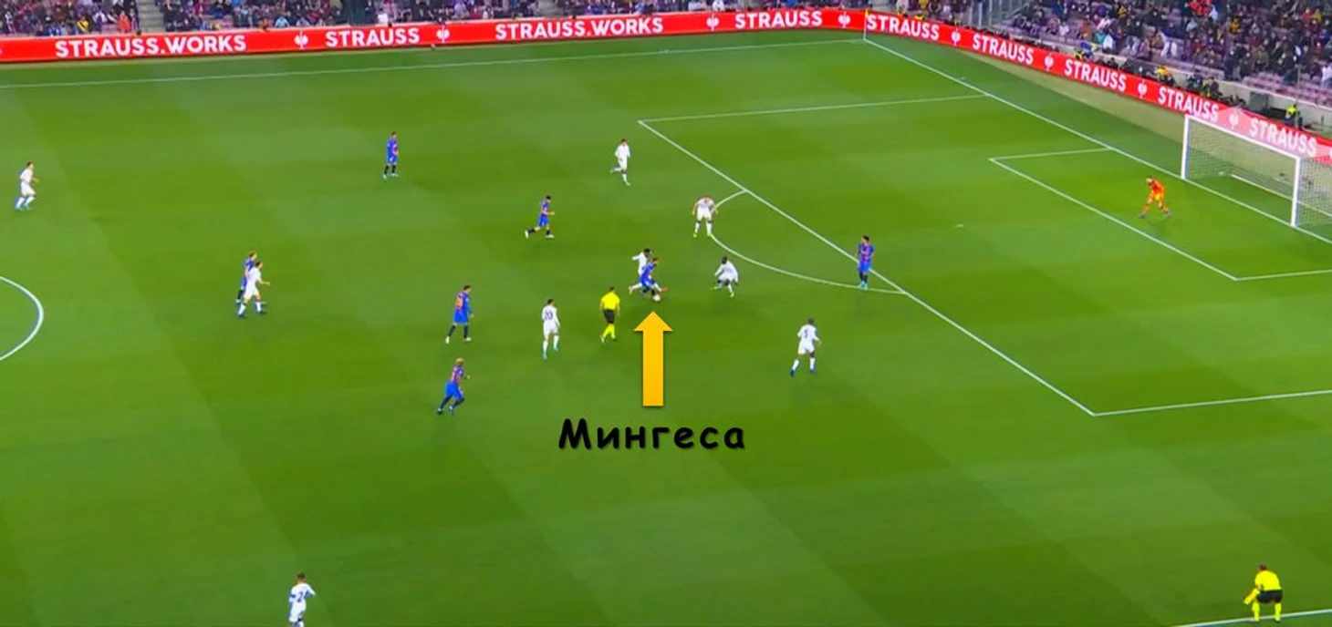 Второй момент – прессинг. Вот, что у Хави получилось поставить очень быстро, так это эффективный возврат мяча и агрессию в центре поля, а также у штрафной площади соперника. Оцените позицию Мингесы на скриншоте ниже. И главное, что в отличие от того же Лангле, Оскар сумел не оголять явно тылы, чтобы через эту зону были какие-то кинжальные прорывы. Конечно, стоит сделать скидку и на то, что «Наполи» не просто так играет в Лиге Европы, а не Лиге чемпионов.