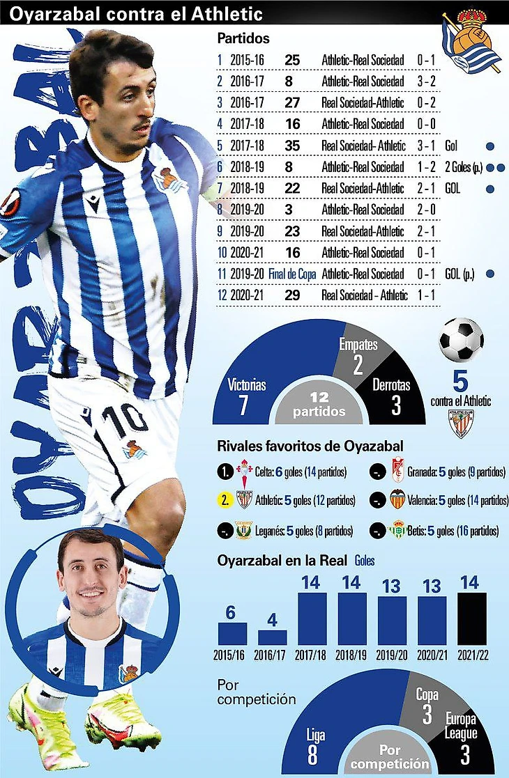 Семь побед, две ничьи, три поражения и пять забитых мяча – такова статистика Микеля Оярсабаля в дерби. Только в матче с «Леганесом» капитан забил больше голов, чем в матче с «Атлетик». Капитан с нетерпением ждет дерби, потому что травма не позволила ему сыграть в первом круге на «Аноэте» игра которая закончилась со счетом 1:1.