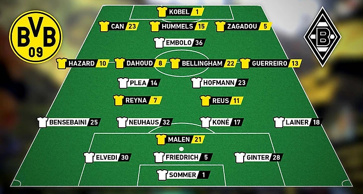 Главный тренер менхенгладбахской «Боруссии» Ади Хюттер против Дортмунда решил применить свою обычную схему 3-4-2-1: Ян Зоммер, Нико Эльведи, Маттиас Гинтер, Марвин Фридрих, Штефан Ляйнер, Куадио Ману Коне, Флориан Нойхаус, Алассан Плеа, Рами Бенсебаини, Йонас Хофманн и Бриль Эмболо.