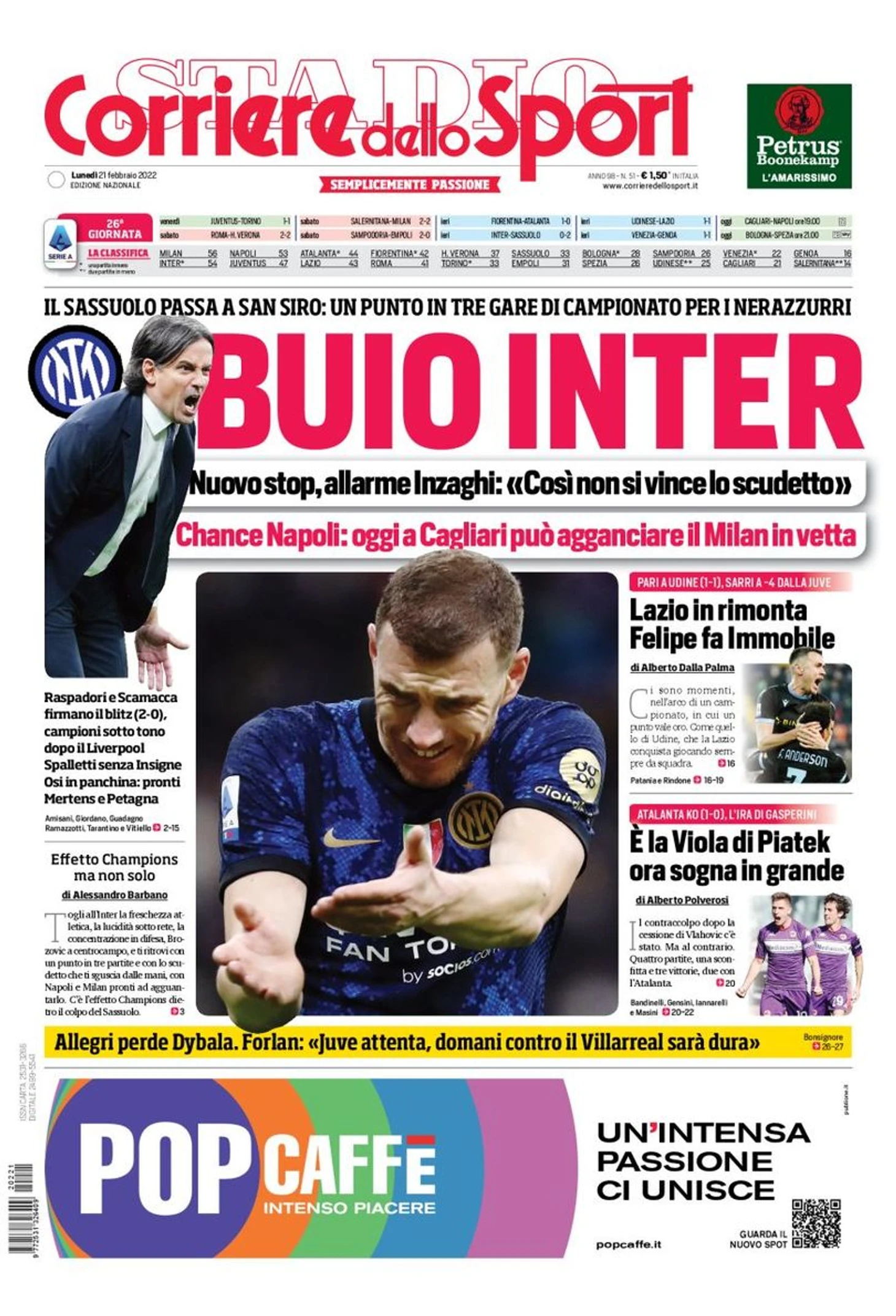 Corriere отдельно выделяет поражение Нерадзурри с заголовком «Тьма «Интера»: «Сассуоло» выиграл на «Сан Сиро»: одно очков в трёх матчах чемпионата для Нерадзурри. Новая остановка, тревога Индзаги: «Так не выиграть Скудетто». Распадори и Скамакка устроили молниеносный выпад (2:0), чемпионы подавлены после «Ливерпуля».