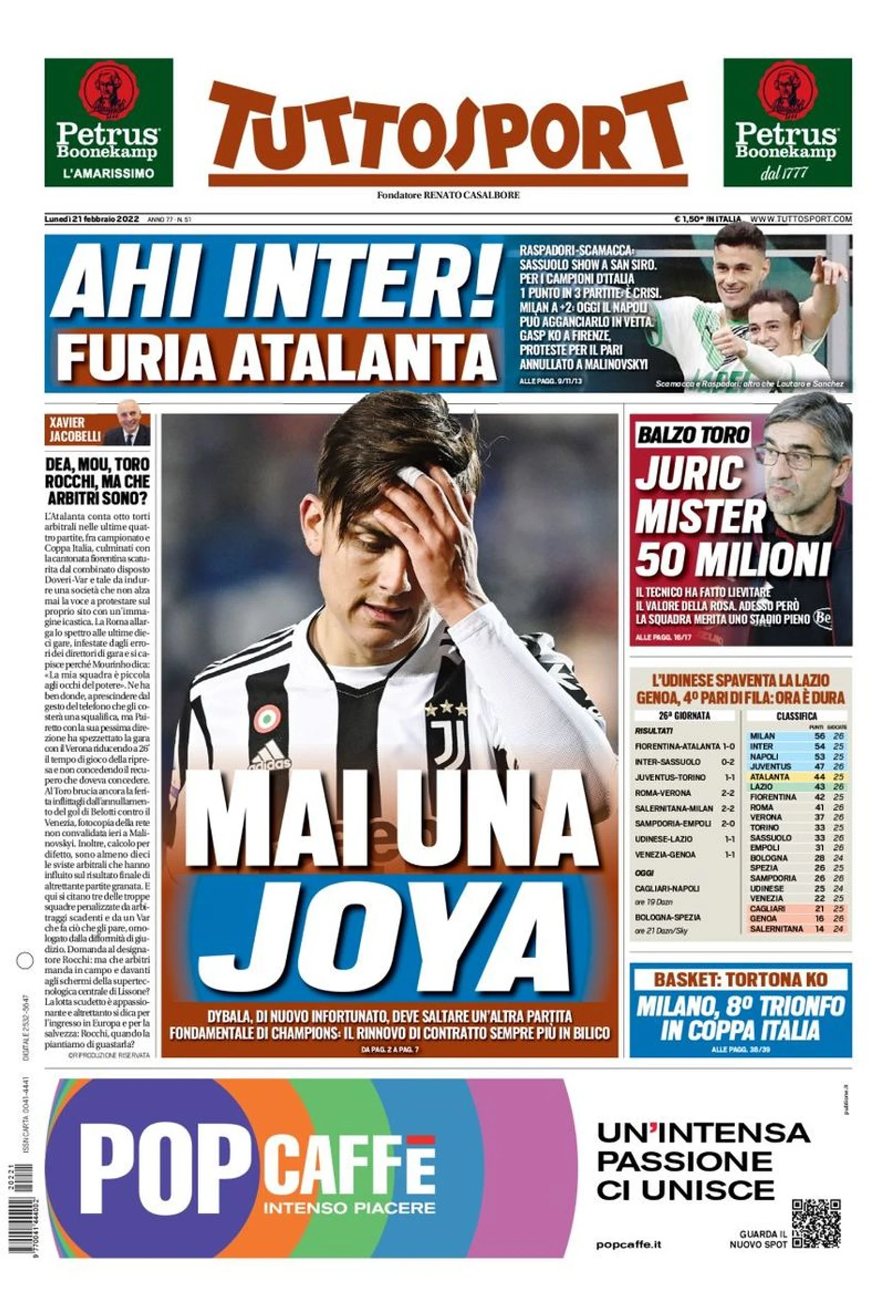 «Никогда никакой радости» – таким заголовком TuttoSport пишет о ситуации в «Юве»: «Дибала, новая травма, он должен пропустить ещё один важный матч в Лиге Чемпионов: продление контракта всё более в подвешенном состоянии».