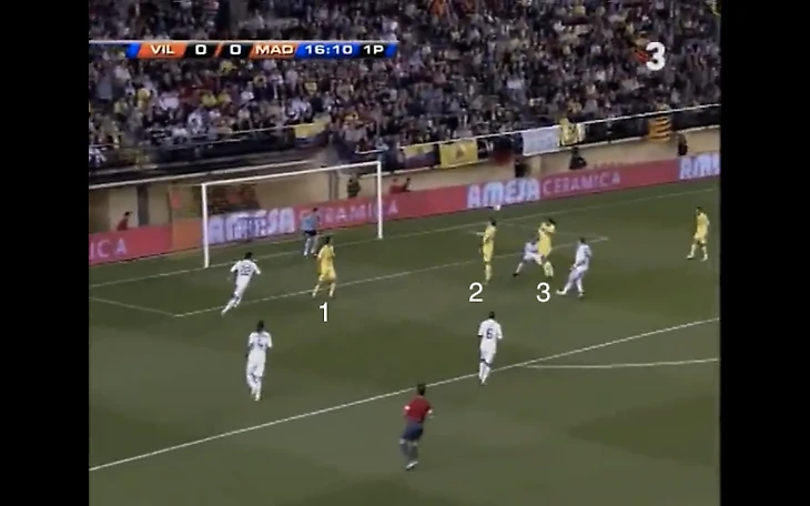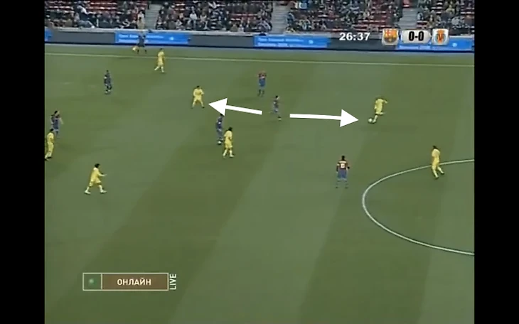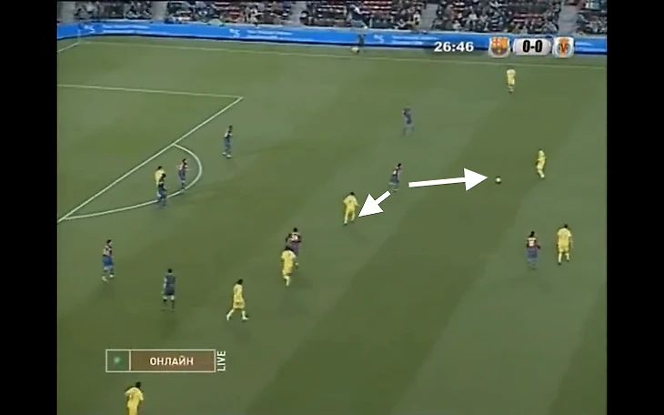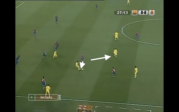 Важным пунктом в розыгрышах была связь между вингерами и нападающими – последние не располагались статично, а наоборот дополняли комбинации. Их классической фишкой были открывания между двумя защитниками соперника – чтобы вингеры «Вильярреала» получали свободу. Грубо говоря, форварды совершали обратный им маневр – смещались из центра во фланг.