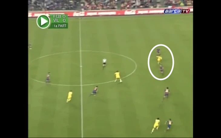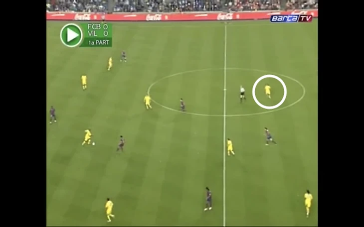 В тактическом плане идея Пеллегрини была сравнима с концепцией ложной девятки. Благодаря смещениям крайних полузащитников «Вильярреал» тоже получал четырех игроков в центре поля и мог легко разыгрывать лишнего. На примере ниже жертвой маневра стал Хави – в течение минуты он трижды разрывается между двумя игроками «Вильярреала»: