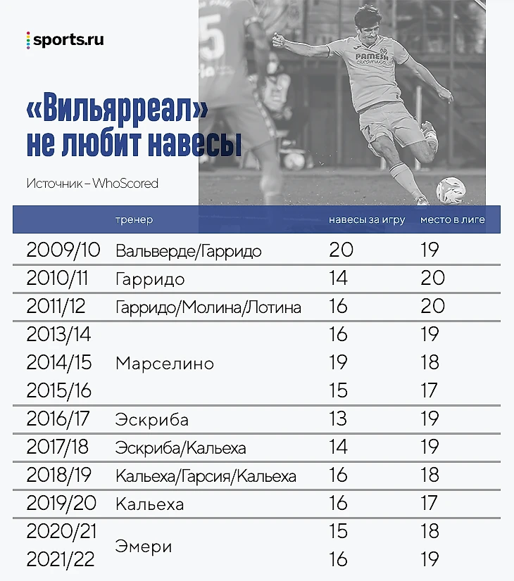 Несмотря на такую выраженную любовь к старомодной (и не совсем испанской) схеме, «Вильярреал» последних 20 лет – синоним симпатичного стиля. Команда почти не использует навесы. У Opta есть данные по 12 сезонам «Вильярреала» в Ла Лиге – во всех команда занимала место в нижней четверке по кроссам в штрафную. Такой стабильности нет даже у «Барселоны» – у каталонцев лишь 9 попаданий в эту четверку.