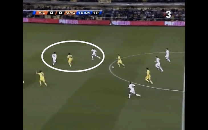 А это уже последний сезон Пеллегрини в «Вильярреале» и игра с мадридским «Реалом». Правый вингер Кани смещается в центр, чтобы получить пас от Робера Пиреса: