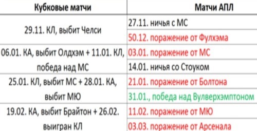 По сабжу: на лицо помеха кубковых матчей результатам в АПЛ, травмы и не сыгранность команды (фактическое отсутствие того самого костяка, вокруг которого и строится коллектив), а также нестабильность в плане игровой формы. Плюс ко всему очень сильно разочаровывает Даунинг. В общем на многие вопросы Королю ещё только предстоит дать ответы.
