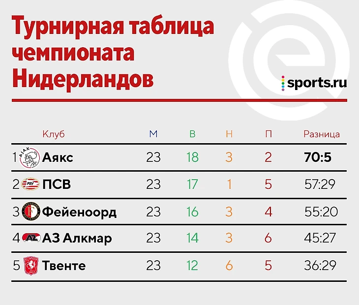 В середине января мы рассказывали о парадоксе из чемпионата Нидерландов – «Аякс» шел вторым в таблице с разницей мячей 56:4. Прошел месяц. «Аякс» заслуженно первый, разница мячей еще больше раздулась: