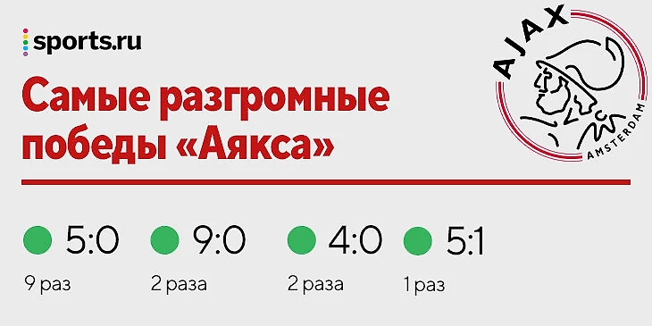 Разгромы – обычное дело для «Аякса» в этом сезоне. Если считать разгромом матч, где разница мячей не меньше четырех (обычно считается +3, но усложним задачу), то у Тен Хага таких игр уже четырнадцать.