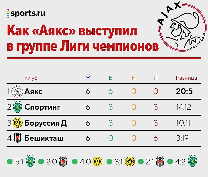 Чуть чаще «Аякс» пропускал в группе ЛЧ. Но и там соотношение забитых и пропущенных впечатляет.