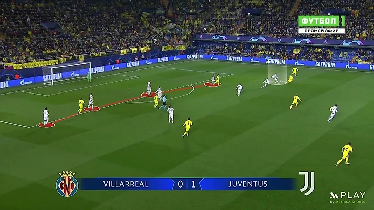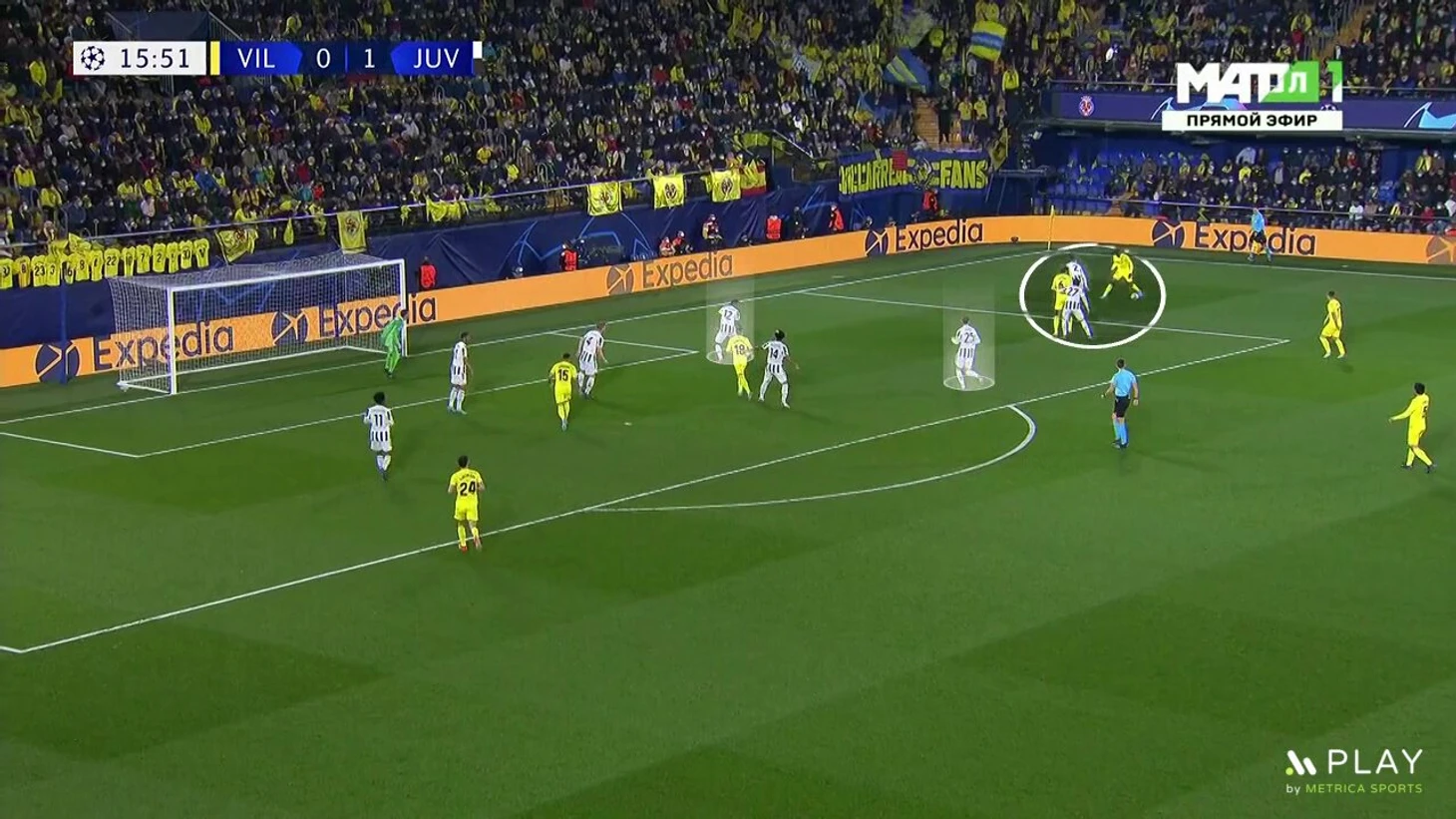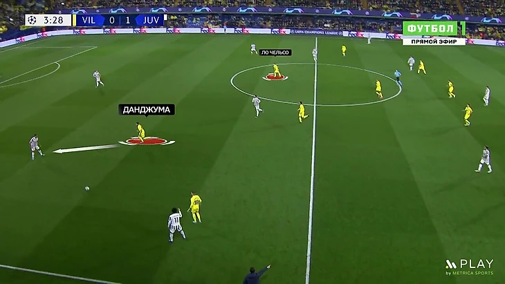 Бонусом шли некоторые преимущества при розыгрышах. Схема «Юве» создавала ситуацию 3-в-2 в первой стадии против 4-4-2 у соперника. «Вильярреалу» было труднее накрывать прессингом. В этом моменте Данджума начинает давление, а Ло Чельсо буквально разрывается между двумя другими центральными защитниками: