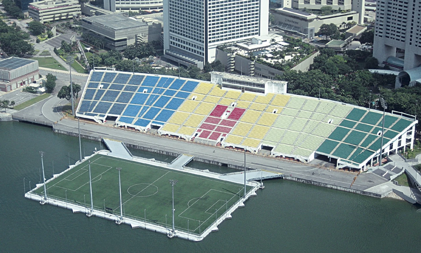 Этот удивительный стадион был построен в 1995 году с вместительностью в 30 000 зрителей. Характерная особенность архитектурной реализации объекта заключается в том, что поле и трибуны отделены друг от друга не только участком трассы Формулы-1, но и водоемом. Интересно сколько мячей оставалось "за бортом"?