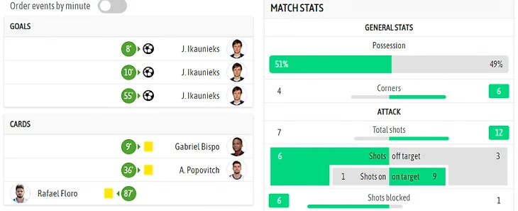 Через две минуты латвиец удвоил перевес, а спустя десять минут после перерыва использовал передачу партнера и установил окончательный результат – 3:0.